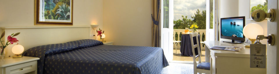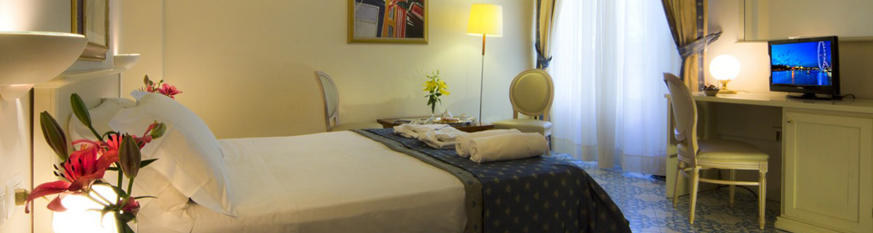 Le camere, arredate con colori chiari e freschi, riflettono perfettamente lo stile classico ed elegante dell’albergo, sono molto confortevoli e dotate di aria condizionata, frigo bar, televisore, telefono, asciugacapelli e cassetta di sicurezza.